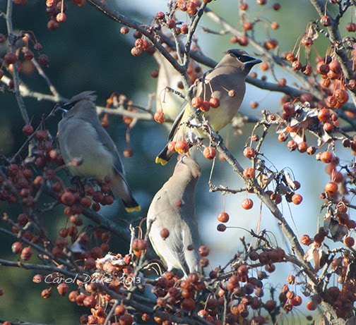 Soon, after the chase, the Cedar Waxwings began doing what waxwings are most often seen in pursuit of . . . harvesting and gulping down little crabapples. I did not know they had such pluck to chase a hawk away.