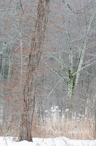 What was I thinking to plant a climbing hydrangea on the beautiful Shagbark Hickory . . . a good trim here and there will open to view some of the striking textured bark. Still, winter does reveal the beauty of this marriage. It is summer when the groovy Shagbark is lost to me. Lichen alters another tree’s bark, as noted in the distance, on a sound and solid oak.