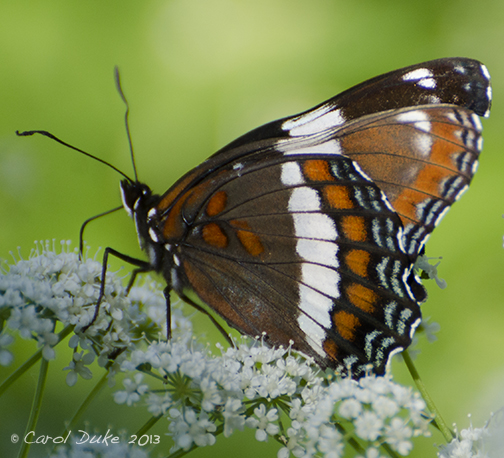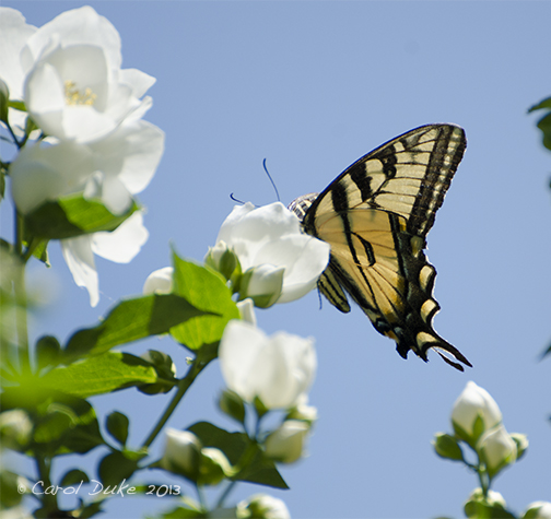 One cannot miss the many butterflies that flit about and at this time, thirty or more larger, Tiger Swallowtails may flutter into view and light upon a favored delicious white bloom. Numerous others are about . . . too many to name for now, but I have added an Admiral, a Fritillary and a Sulphur for those who share my thrill for Lepidoptera. As you stand near the large Hydrangeas, you will no doubt notice the bustle of native bees . . . the whir of the busy pollinators seems to make the bushes vibrate.