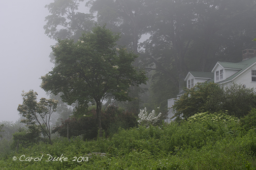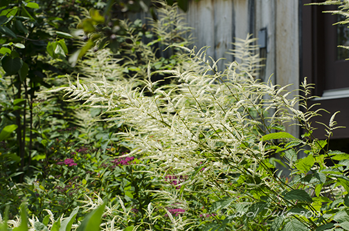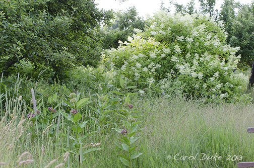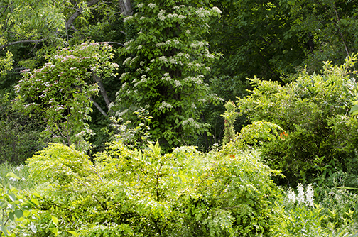 For color . . . there is a focus . . . a play of mostly whites within and above the greens. Kousa Dogwood, Sweet Fern, Goat’s Beard, Budding Bugbane or Cimicifuga, another native I have forgotten – rather like a fringe tree only a perennial, Tree Lilac, Hydrangeas, Mock orange, Climbing Hydrangea, Viburnum and more add texture and delight along this walkabout.