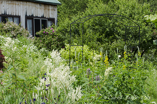 Walking though the gardens here at Flower Hill Farm in mid to late June can be intoxicating and enchanting. While strolling and scrolling down, be sure to imagine a gentle breeze blowing through leaves and fronds . . . the greenery in continual movement . . . a verdure river of vegetation. The air gently caressing your skin and hair, while delivering or wafting nature’s exclusive perfume . . . no artificial chemicals here . . . to your alert olfactory organs. Clouds, slowly forming, hang in the vast canopy of azure sky above. No nagging mosquitoes or flies . . . for the Tree Swallows, you will note, are gently sweeping the sky, while dragonflies zigzag by.