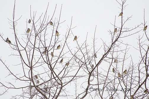 Surrounded by colors of autumn and captured through glass, so as not to frighten the timorous Cedar Waxwing, I cannot quite focus the bright yellow tip of its tail or the yellow wash covering its downy belly. Tiny apples are hanging temptations, little-bitty baubles, winter apples waiting to be plucked. Only these are nourishing . . . vital winter food for the waxwings, robins and wild turkeys too.