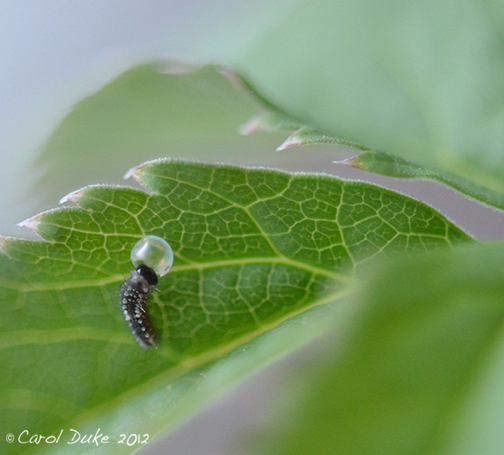 The dark head of the tiny caterpillar can be seen in this photograph.