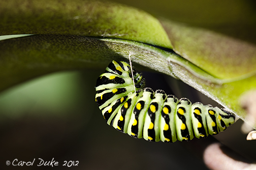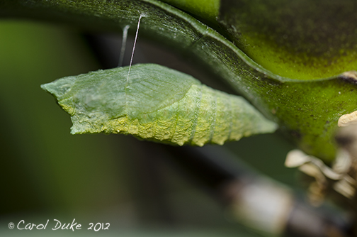 The Black Swallowtail caterpillar chooses the underside of an orchid leaf to unveil her chrysalis.