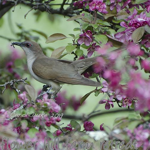 Mourning Doves coo and are often observed here in pairs. The cuckoo is elusive and rarely sighted at Flower Hill Farm. These birds are not in the same family. I have them here together for convenience. Mourning Doves are common but the Black-billed Cuckoo is on several lists of concern. Their population seems to be declining. They are very secretive and will occasionally lay eggs in other birds nests but not so often at their European cousins or the Brown-headed Cowbird. They have a voracious appetite for caterpillars. The day I captured the (for me) rare photos of the Black-billed Cuckoo, I was able to get a sequence of his hunting and successfully snaring a hapless grasshopper. I was pretty far away at the edge of the field but he was keeping a close eye on me.