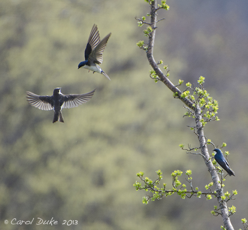 Tree Swallow calls, songs and duets fill the early spring sky with grace and gurgling as females wrangle.
