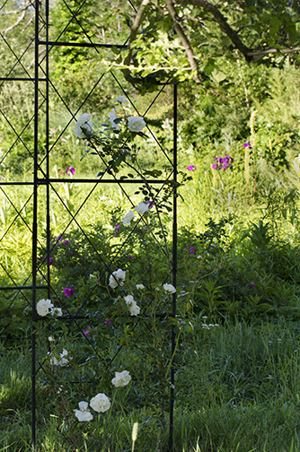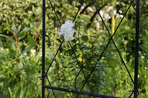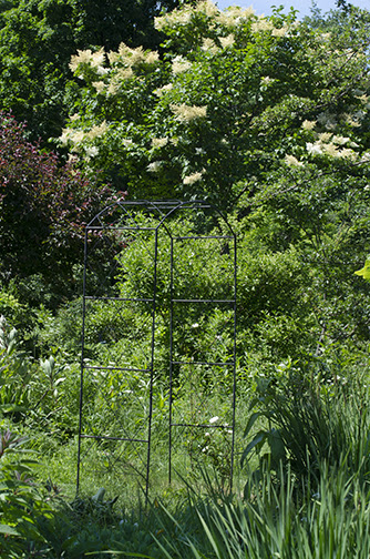 A new addition to the gardens. A simple metal arbor . . . something to grow on. I love how it nearly disappears into the garden green.