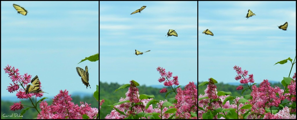Eastern Tiger Swallowtails Papilio glaucus in threes flitting above and about Miss Canada Lilac this past June.