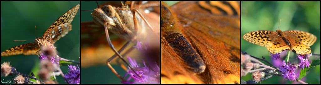 Do you ever wonder what became of the fifth and sixth legs of some butterflies? If you look closely you can see one of those tiny legs next to the spotted eye of this fritillary. I am not as familiar with these as I am with monarchs, who use those tiny legs to prick and taste milkweed for freshness. Some scientist believe butterflies are evolving to have only four legs. I think those tiny legs come in pretty handy to aid in balance and . . . well we will see what time tells.