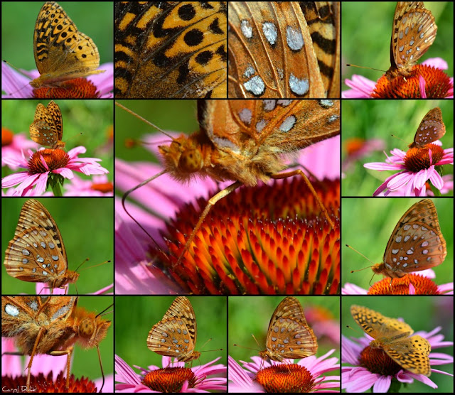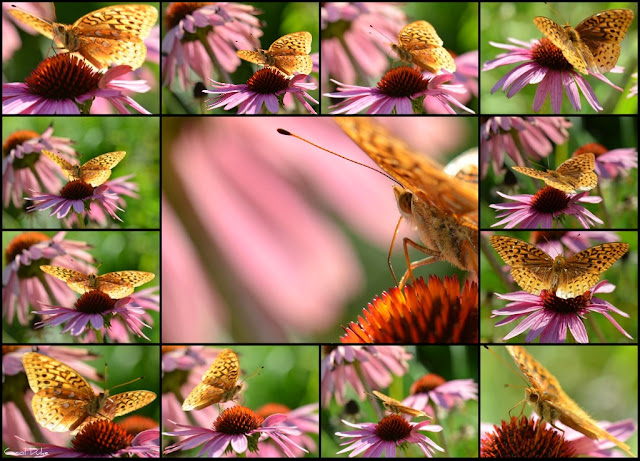 Each of these composites is of a different butterfly on a different day. Three July days . . Four Great Spangled Speyeria cybele, butterflies . . . many frames.