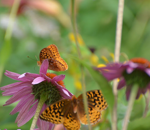 Fritillaries busy themselves placing their probosces in tiny florets between the flaming darts of coneflowers and are not bothered by my coming in rather closely. They are in constant motion, however, making it difficult to clearly capture them.