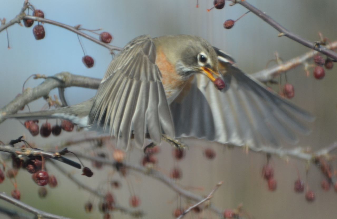 Robins fill the crabapples and reap the benefits of dried fruit.