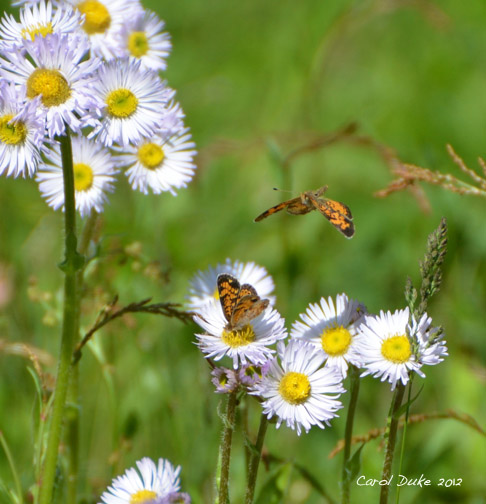 Last year in my Butterfly Review I wrote a bit extensively about these small butterflies in a piece here and also here. The second link takes us back to a day in 2010 when I was enchanted by hundreds of Pearl Crescents darting about the middle meadow garden.