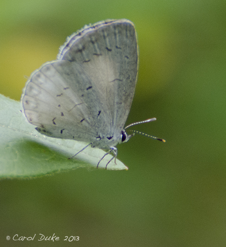 At the beginning, the land forms what appears to be a mini meadow. . . and there . . . during June . . . I was sure to encounter a fellow member of the Gossamer-wings family the American Copper on any day I venture there. Now, in July, I have found these little blues sunning and flitting about in this area and further up towards the end of the path that opens out into the north field. I can walk around the fields and gardens for an hour or more . . . even a day may go by . . . and return to find perhaps the same Eastern Tailed-Blue or another one claiming this little microscopic territory as its own.
