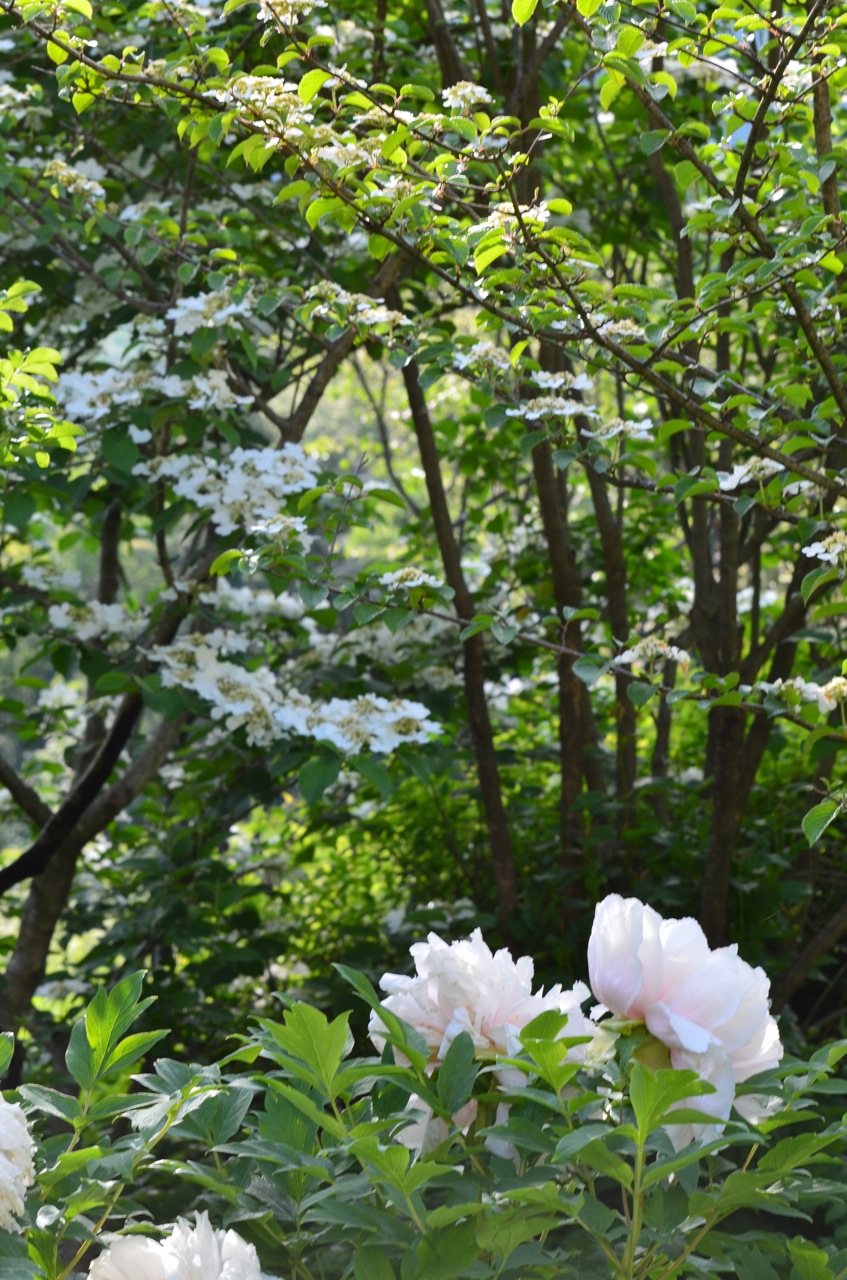 Early Lilacs and Viburnums have faded, while the later to bloom of both are coming into their own along with the Hawthorn trees in the distance. Viburnum plicatum in Upper South Garden is full blown right now.
