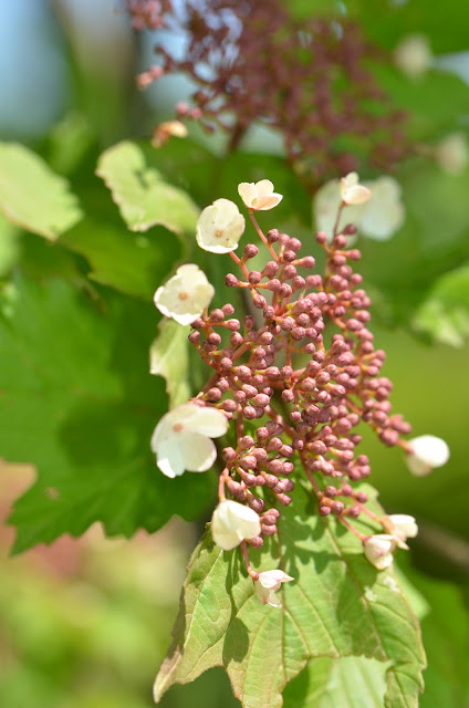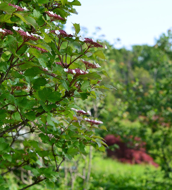Viburnum sargentii ‘Onondaga’ early stage of blooming . . . before climbing hydrangea on Shag Bark Hickory in Upper South Garden.