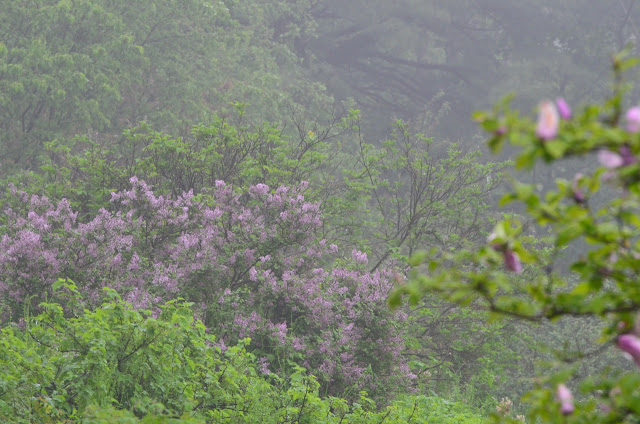 ‘Miss Kim’ Lilac in the mist with a Magnolia (right) that never quits blooming.