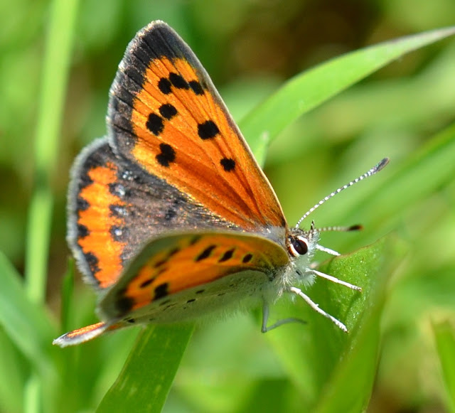 I love and revere all the many trees and plants here at Flower Hill Farm . . . but OH, when wildlife call the gardens, fields and forest home I get very excited to discover who lives so nearby and REALLY happy to make new acquaintances. This TINY American Copper Lycaena phlaeas americana, looks very fresh and would sit still . . . in the south field . . . long enough for me to capture a few portraits. What a precious vibrant butterfly!!