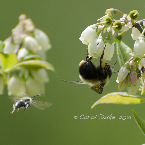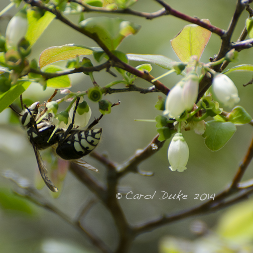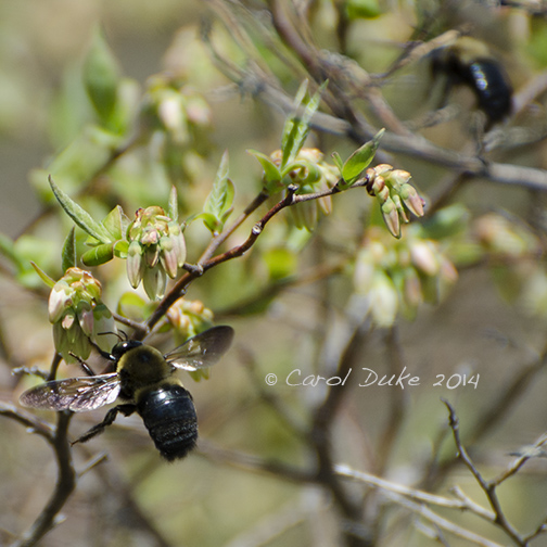 Here is a collection of native bees and wasps I sighted in the gardens last year. Bees and wasps keep busy buzzing about blooming plants in the blueberry and wildflower fields, perennial beds, shrubberies, and trees that are their habitat. These important pollinators are sometimes forgotten when most conversations lead towards the endangered European honeybees. Carpenter bees and others are already being used to help pollinate crops. If you click on the images a slide show will pop up with the identity of each species.
