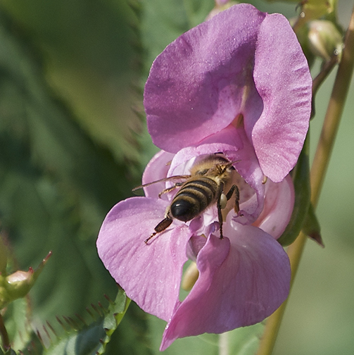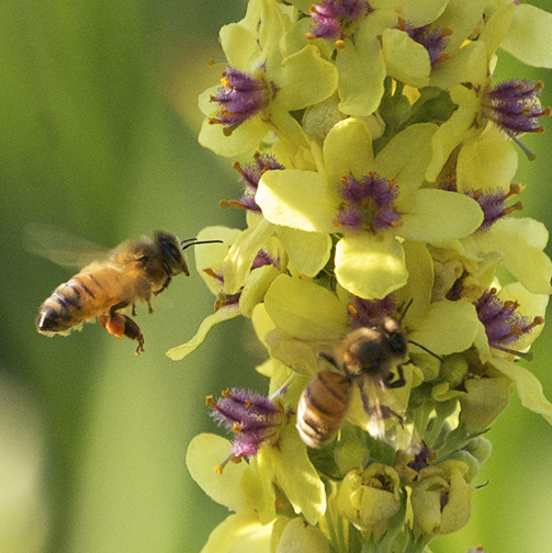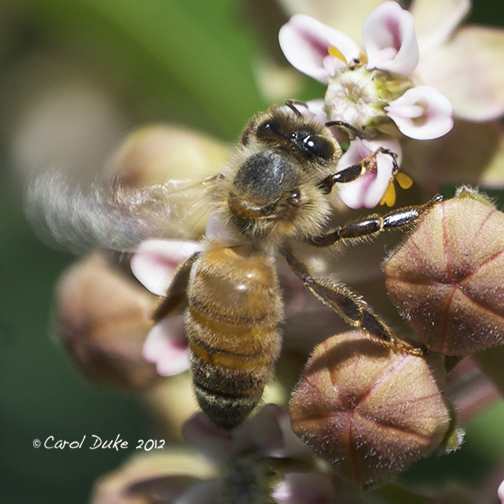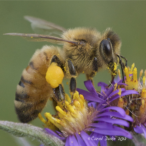 Pollinators are so very important for the health of our world, for our very existence. Too often people are frightened when they hear even the name mentioned. Sadly, poisons are used to kill bees, wasps, hornets, and other native bees. It is critical that we ban toxic pesticides that are killing these beneficial insects. The European Honey Bee is featured here along with native bees. I was blessed to be able to observe a colony of “wild” honey bees that lived in a cavity in one of my Rock Maples next to the farmhouse here at Flower Hill Farm Retreat. I was stunned that I was able to walk right up to a swarm that lay like a mantle over a branch in my garden. Here are some of the images I was able to capture along with the busy comings and goings of other honey bees of the genus Apis and native bees in the gardens. I am still learning about bees. There are about 20,000 species of bees, so I will never get bored.
