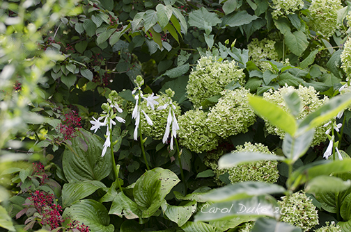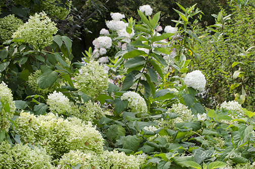 By now, many of the bouncy snowballs of Annabelle’s Hydrangea are carpeting the garden floor revealing the Tree Hydrangea beginning to blush in the background.