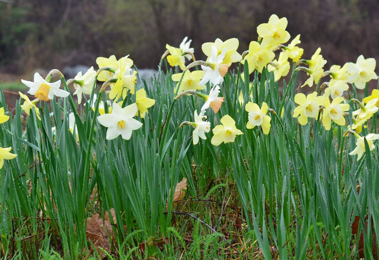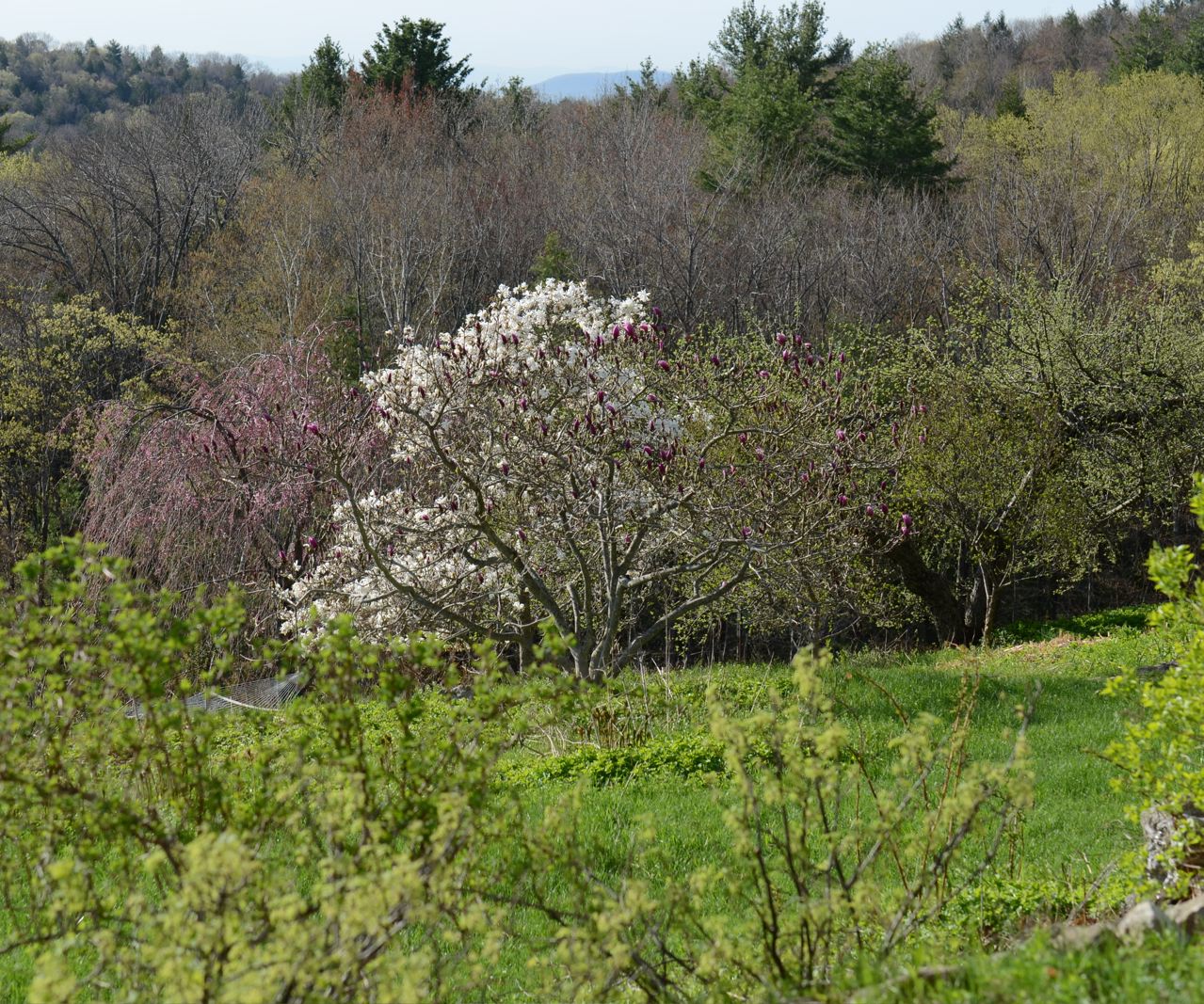 | Just behind house Currants looking down through Magnolias and Apple into Weeping Cherry and Mount Tom |