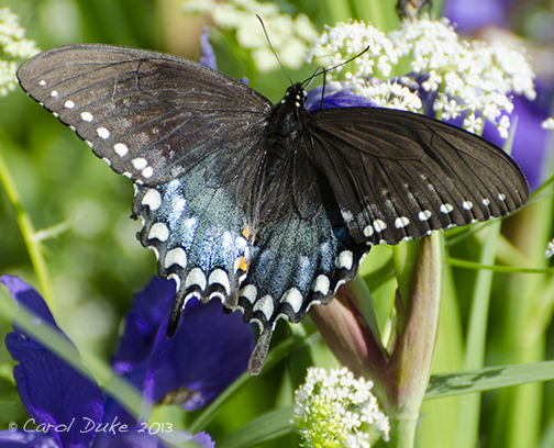 A Spicebush Swallowtail Papilio troilus visits our gardens and this is my first sighting of this species here at Flower Hill Farm. I am not aware of the host plant Spicebush Lindera benzoin, growing on our land but perhaps a neighbor is cultivating it. I will be sure to add this native plant to our gardens soon.